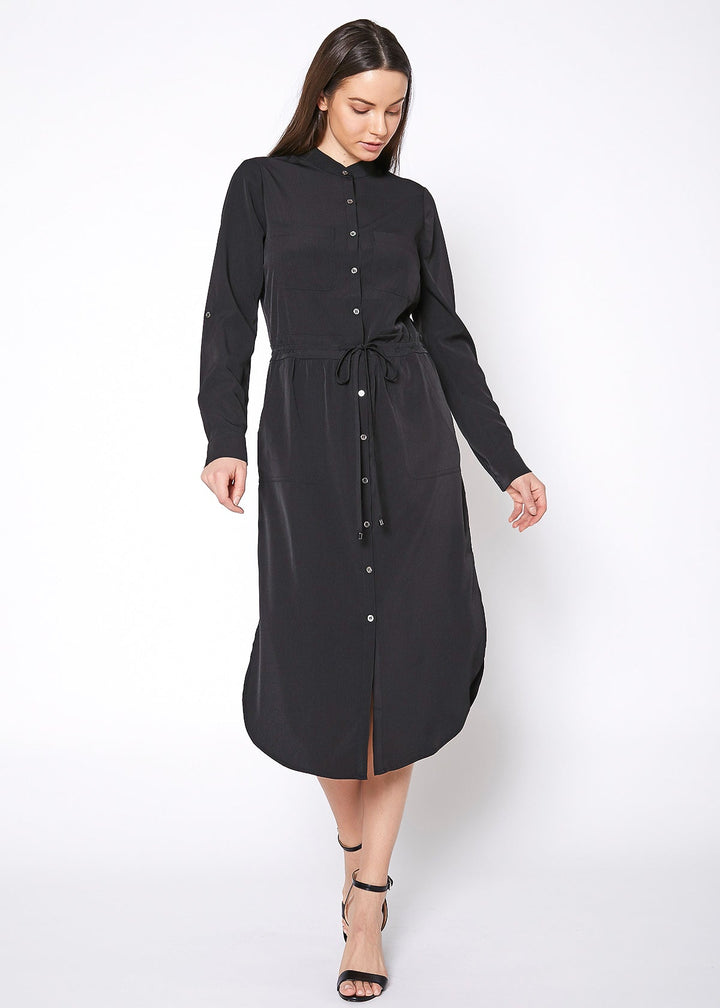 Women's long mock neck shirt dress for an elevated, sophisticated look.