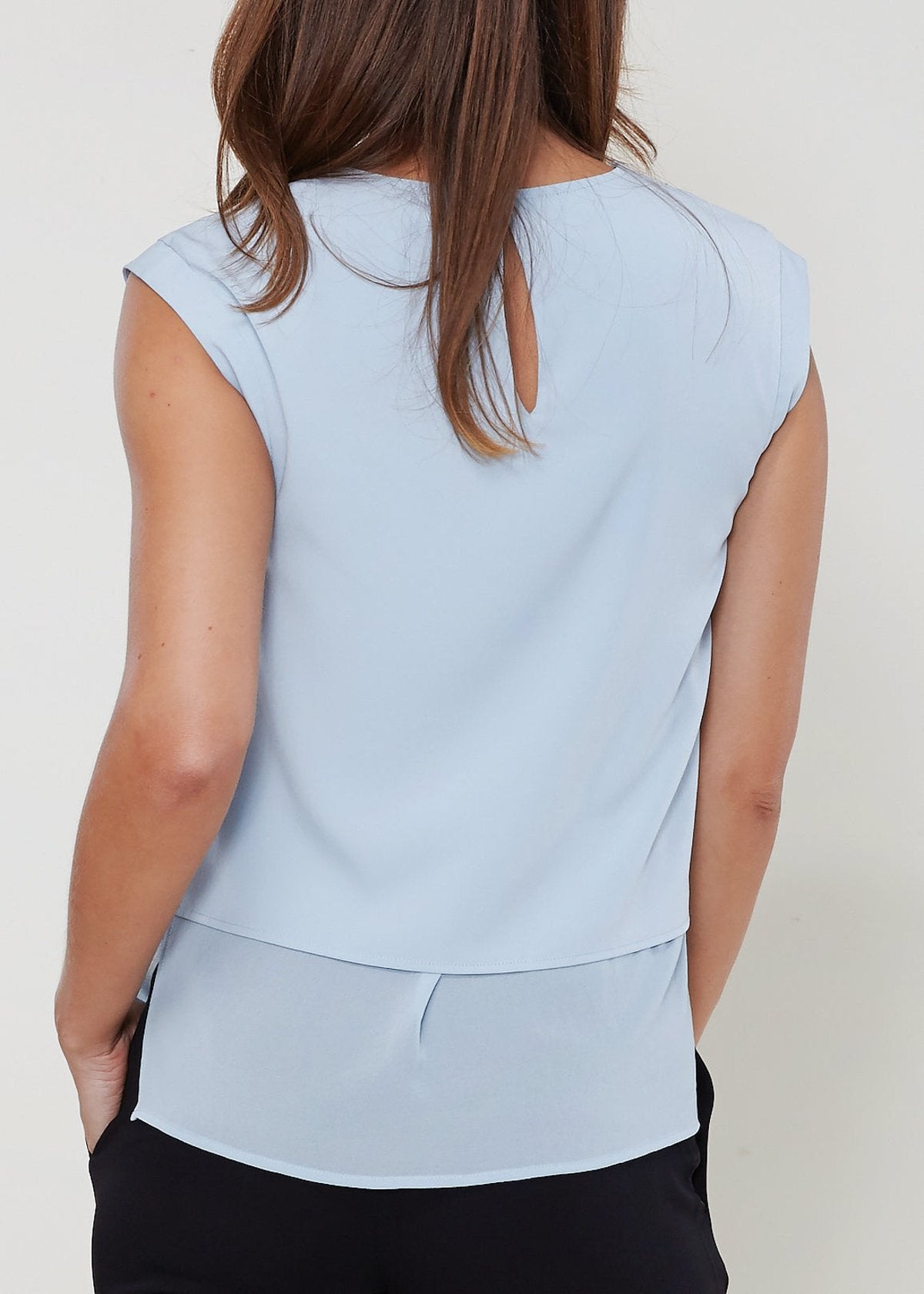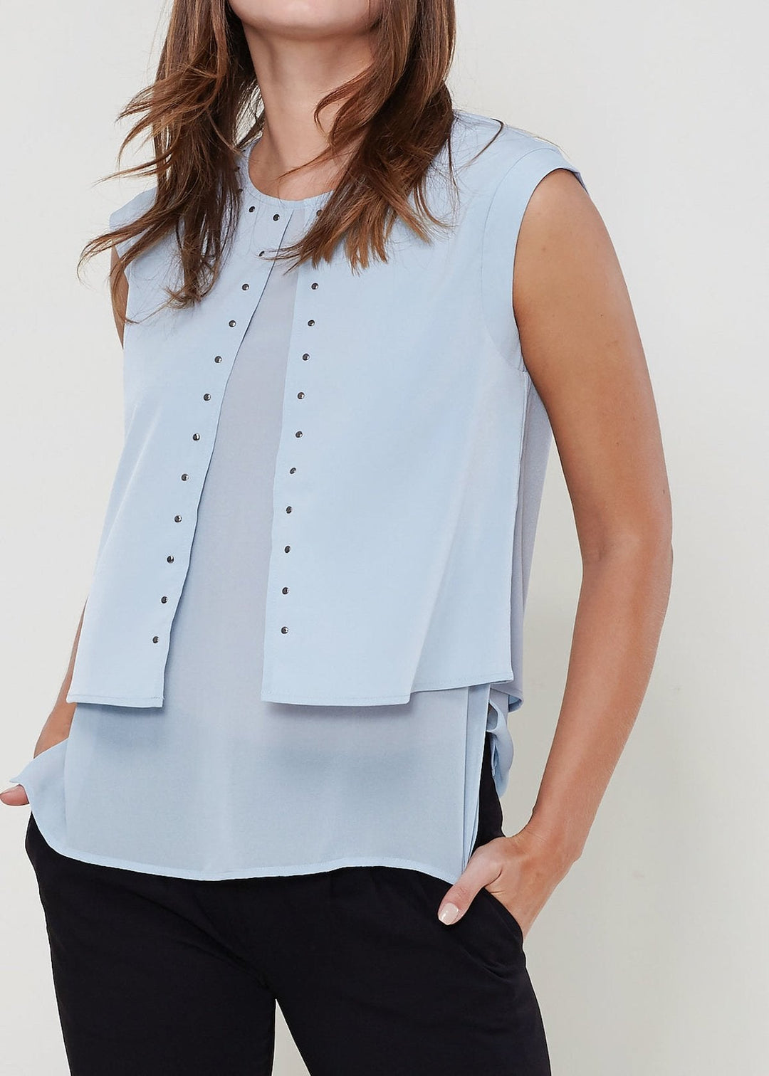 Delicately accented with rivet trimming on the front, this sleeveless top is layered with a mesh fabric for a touch of luxury. -The button closure at the back adds an elegant touch to this exclusive piece.