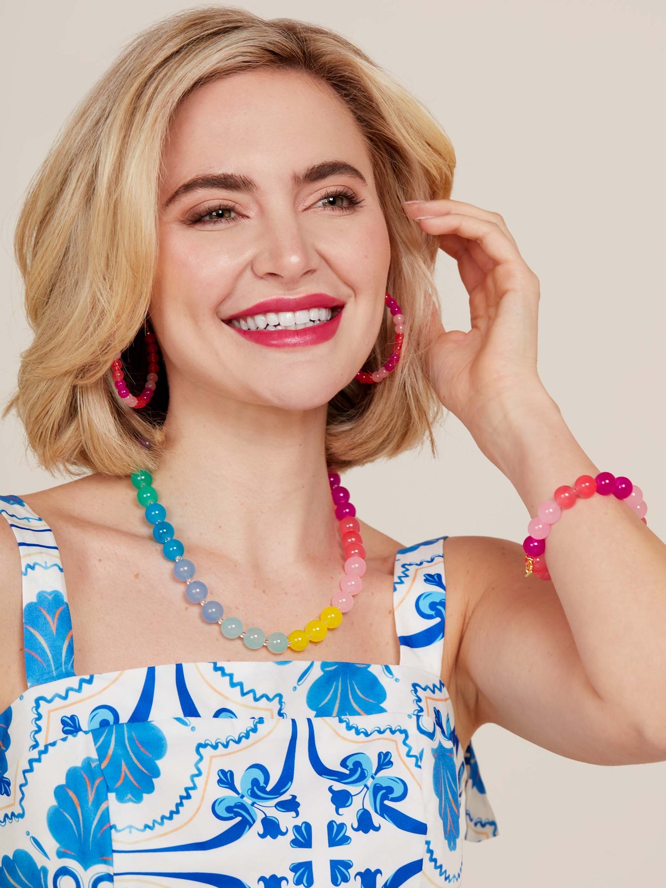 Zoe gives off positive vibrations in dreamy shades made of glass beads for a whimsical touch. Made to stretch, they are comfortable worn alone or stacked.